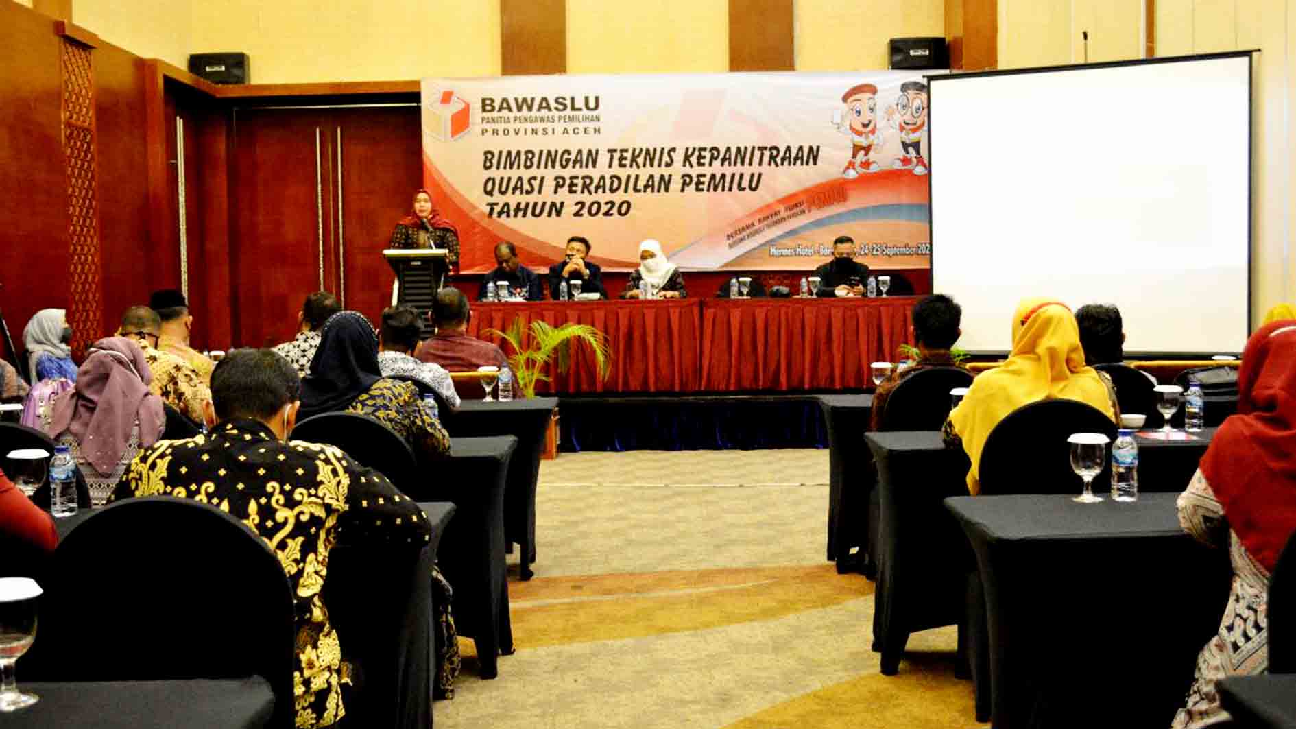 Banda Aceh - Koordinator Sekretariat Panwaslih Kabupaten Aceh Timur mengikuti kegiatan Bimbingan Teknis Kepaniteraan Quasi Peradilan Pemilu yang diselenggarakan oleh Panwaslih Provinsi Aceh Pada Kamis (24/09/2020) di Banda Aceh. Kegiatan yang dilaksanakan selama 2(dua) hari tersebut diikuti oleh seluruh koordinator sekretariat dan staf divisi penyelesaian sengketa kabupaten/kota se-aceh. Kegiatan tersebut dibuka oleh ketua Panwaslih Provinsi, Faizah, S.P, dan juga dihadiri oleh seluruh anggota komisioner Panwaslih Provinsi Aceh lainnya.